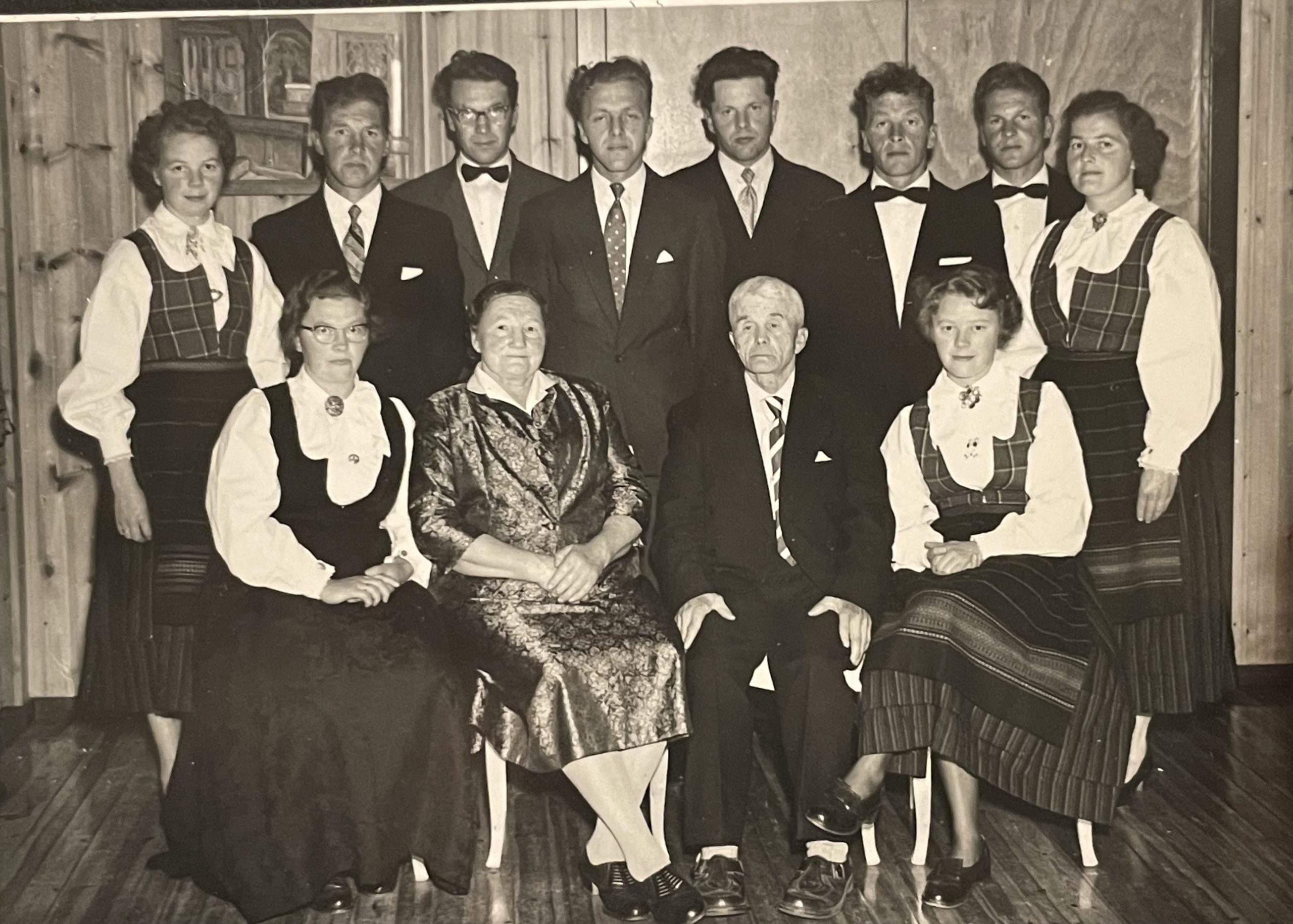 Heile gjengen samla. Bak frå venstre: Thea, Ola, Magnar, Magnar, Reidar, Trygve, Ragnar og Målfrid. Fremst: Anna, Maria, Jo og Jarnfrid.