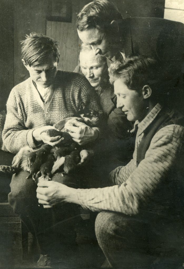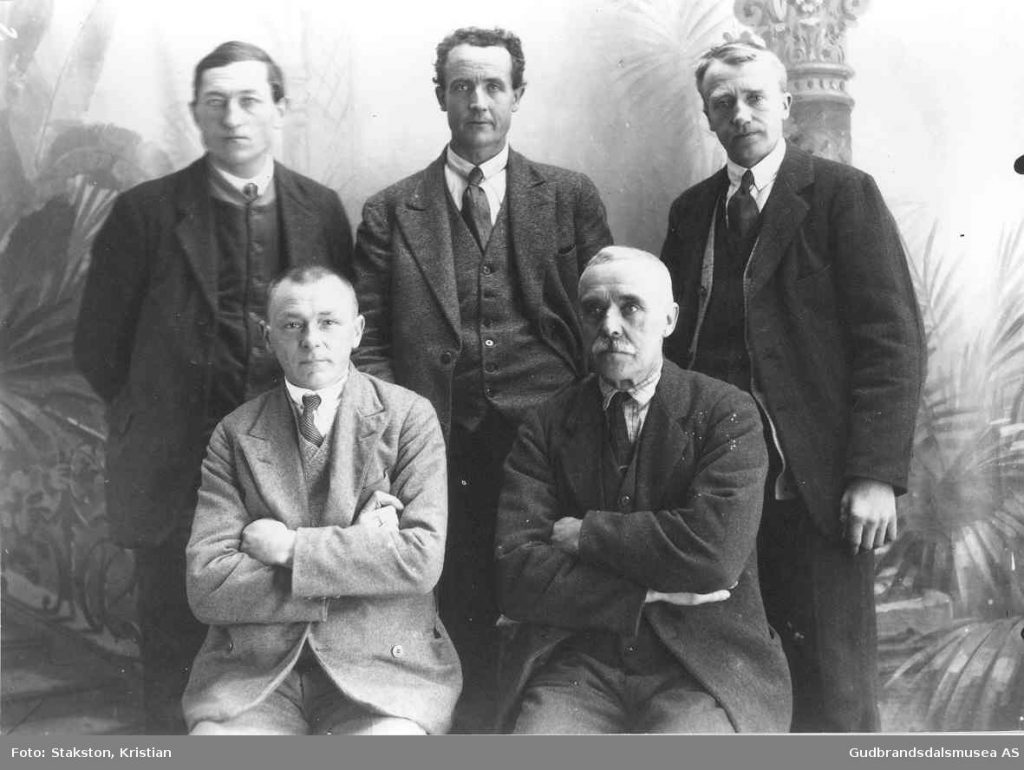 Bak f.v.: Ola F. Gjeilo (gardbrukaren, f. 1891), Jon Melby (tenestkar, f. 1904), Torø Gjeilo (f. 1915 g. Rudsar), Embjørg Gjeilo (f. 1913 g. nygarden Gjeilo) og Audun Alsgård (kontrollassistent)