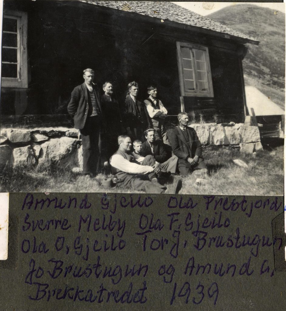 Frå digitalmuseet: Fremst f.v.: Ola Prestgardsøygard (og kalla Krull-guten, tenestkar, f. 1862), Embjørg Prestjordshaug (tenestjente, f. 1901) med Julianna Gjeilo (f. 1917 g. Strandi), Torø Gjeilo (kårkone, f. Vågåsarøygard 1863) med Gregor Gjeilo (f. 1920), Synne Gjeilo (kone på garden, f. Vågåsar 1893) med Frans Gjeilo (f. 1923) og Gregorius Gjeilo (kårmann, f. 1848)