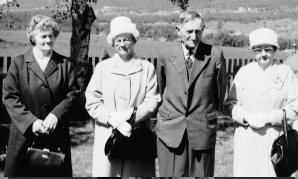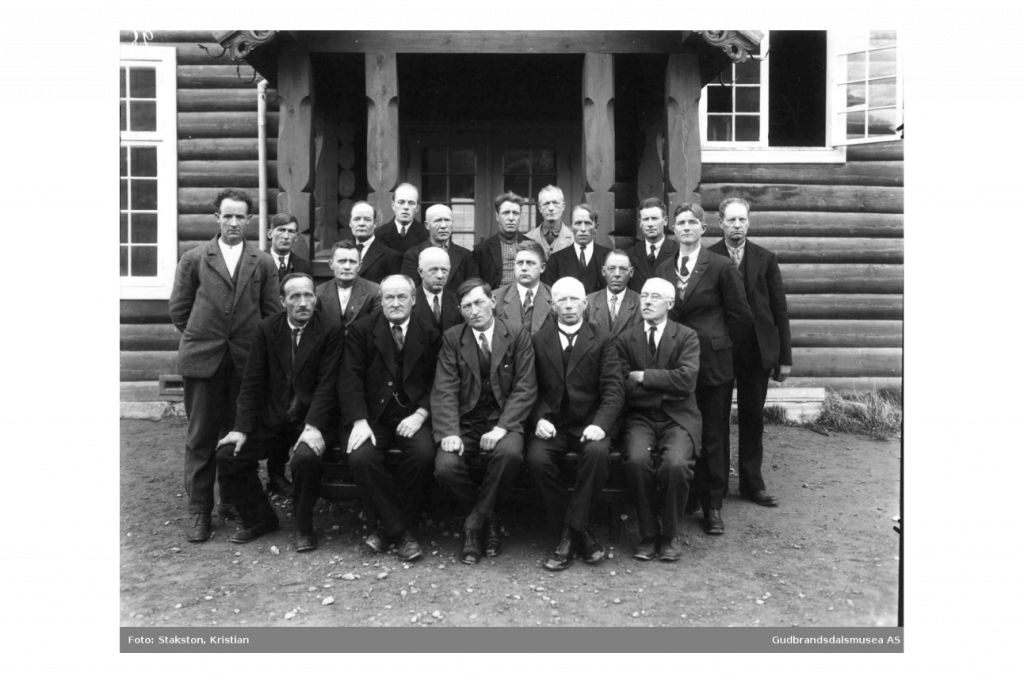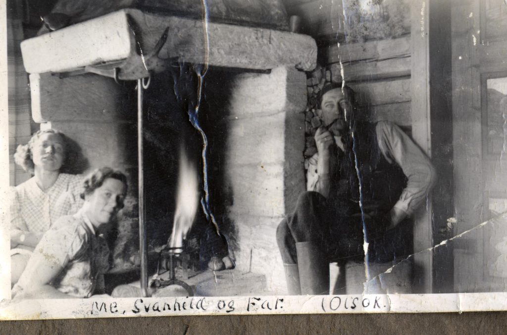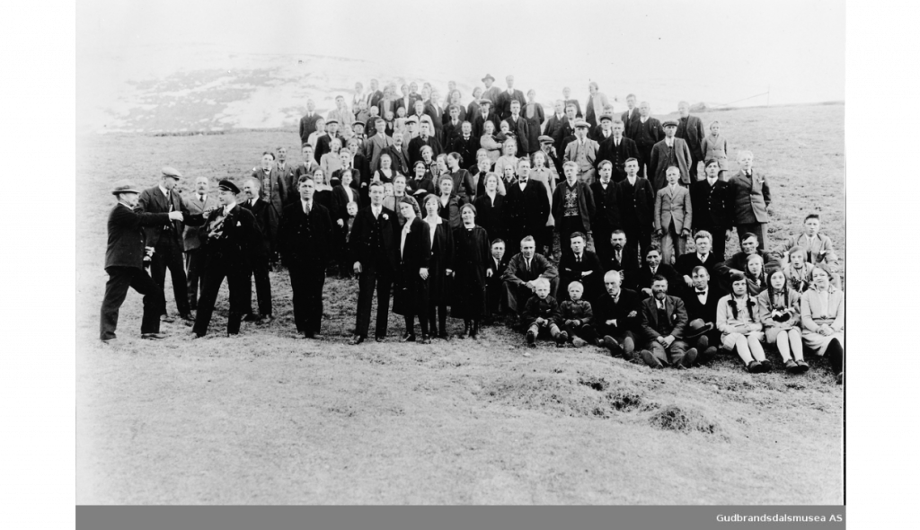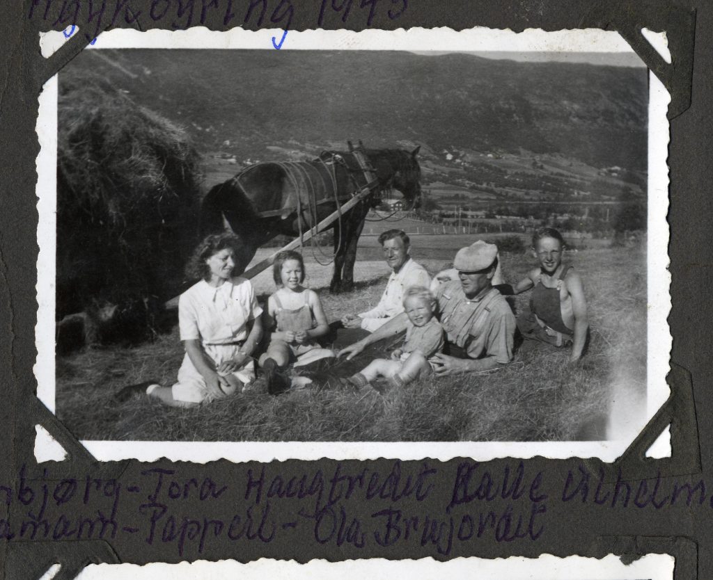 Frå venstre gamel Ola, Embjørg Pr. j. haug med Julie, Torø me Gregor i fanget Synne med Frans og Gregorius. Torø og Embjørg bak sin mor. Bak «eg» (Ola F), Jo Melby og kontrollassistent Alsgård. Julen 1924 på Gjeilo.