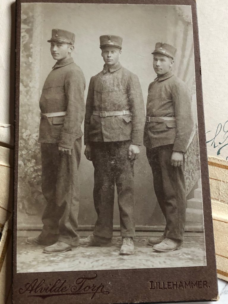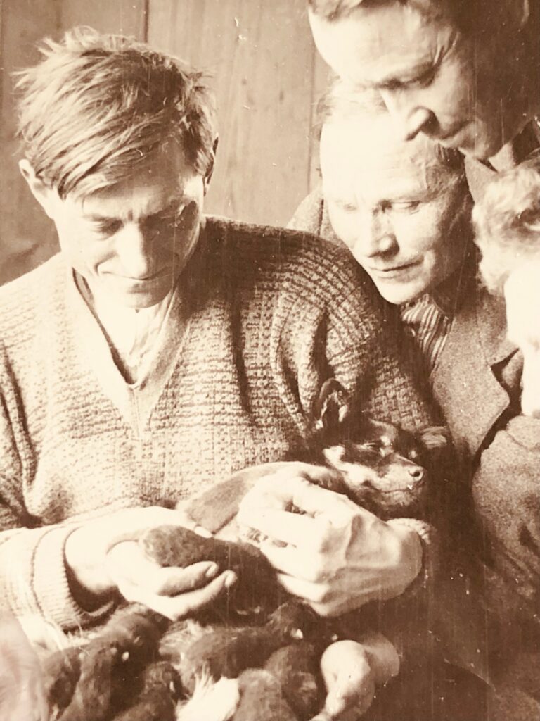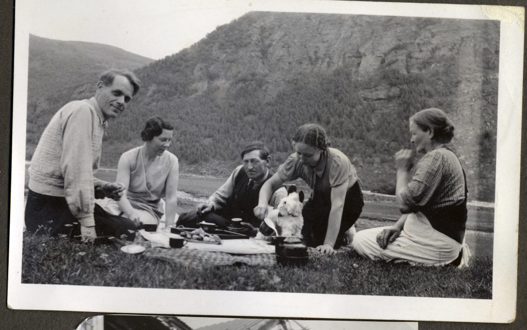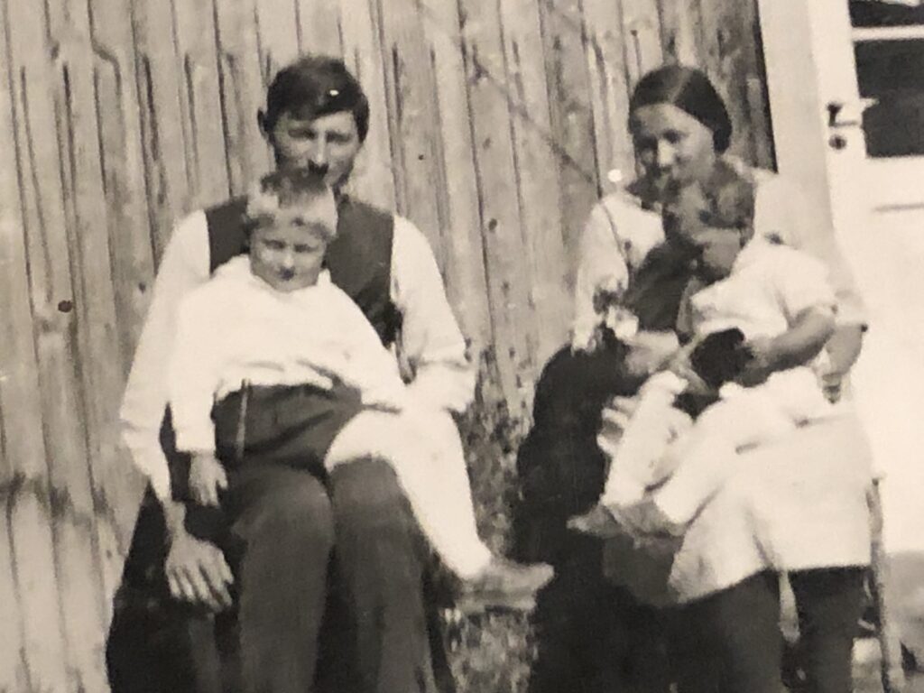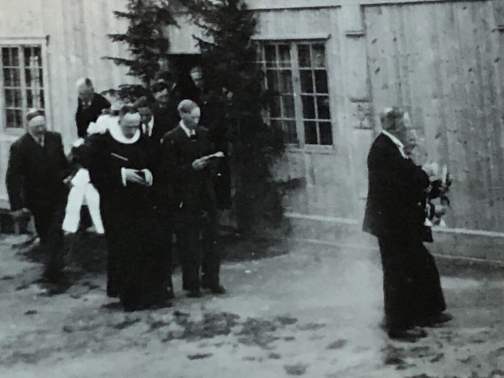 Frå venstre gamel Ola, Embjørg Pr. j. haug med Julie, Torø me Gregor i fanget Synne med Frans og Gregorius. Torø og Embjørg bak sin mor. Bak «eg» (Ola F), Jo Melby og kontrollassistent Alsgård. Julen 1924 på Gjeilo.