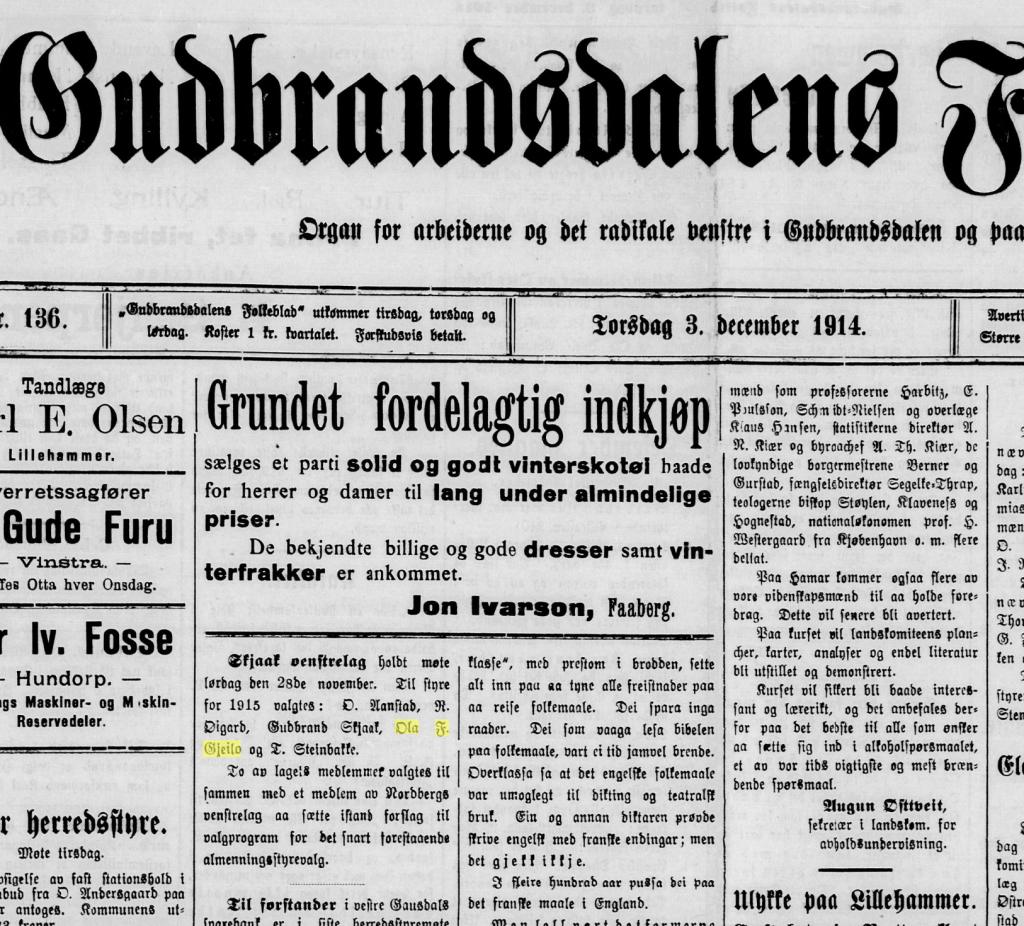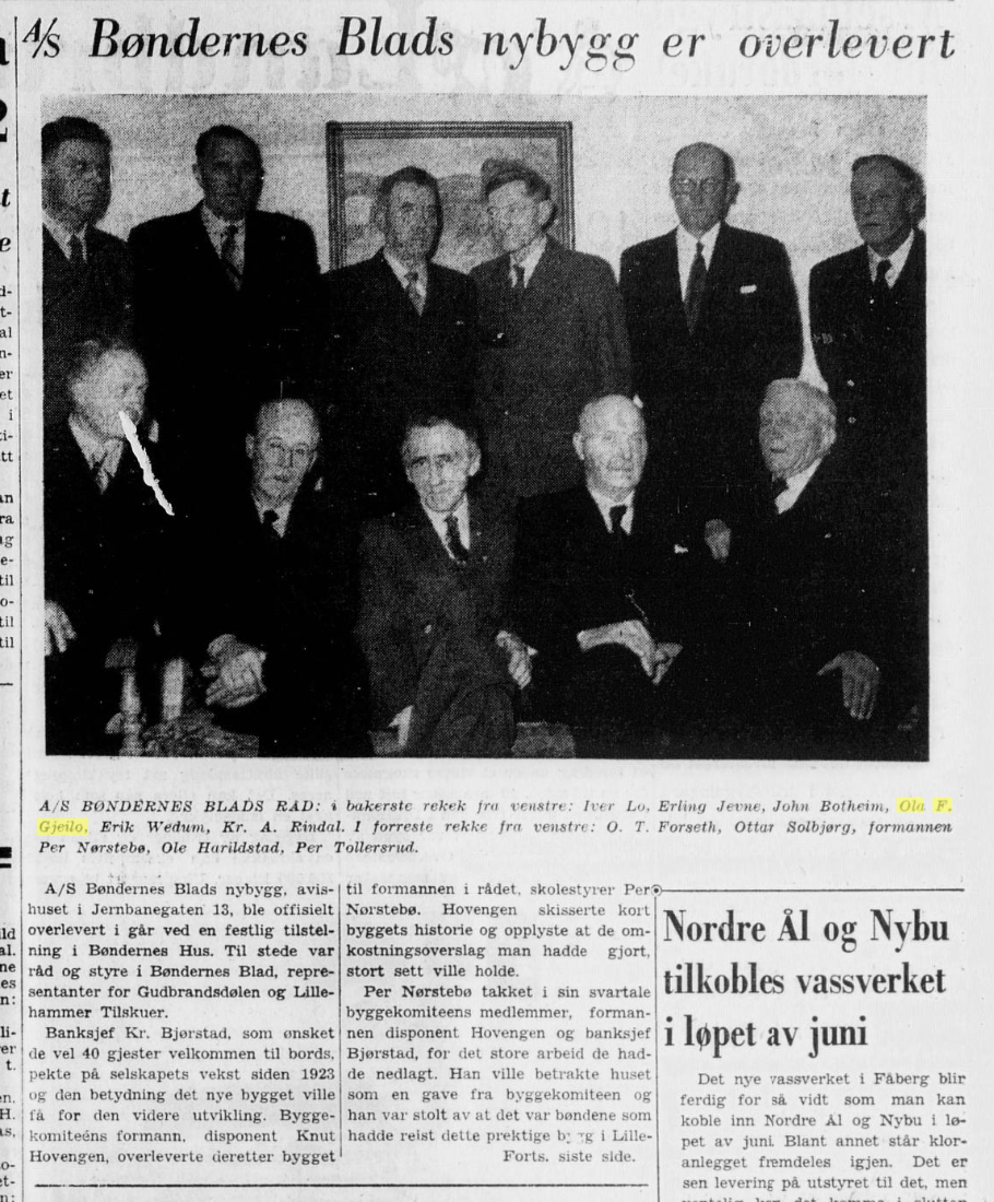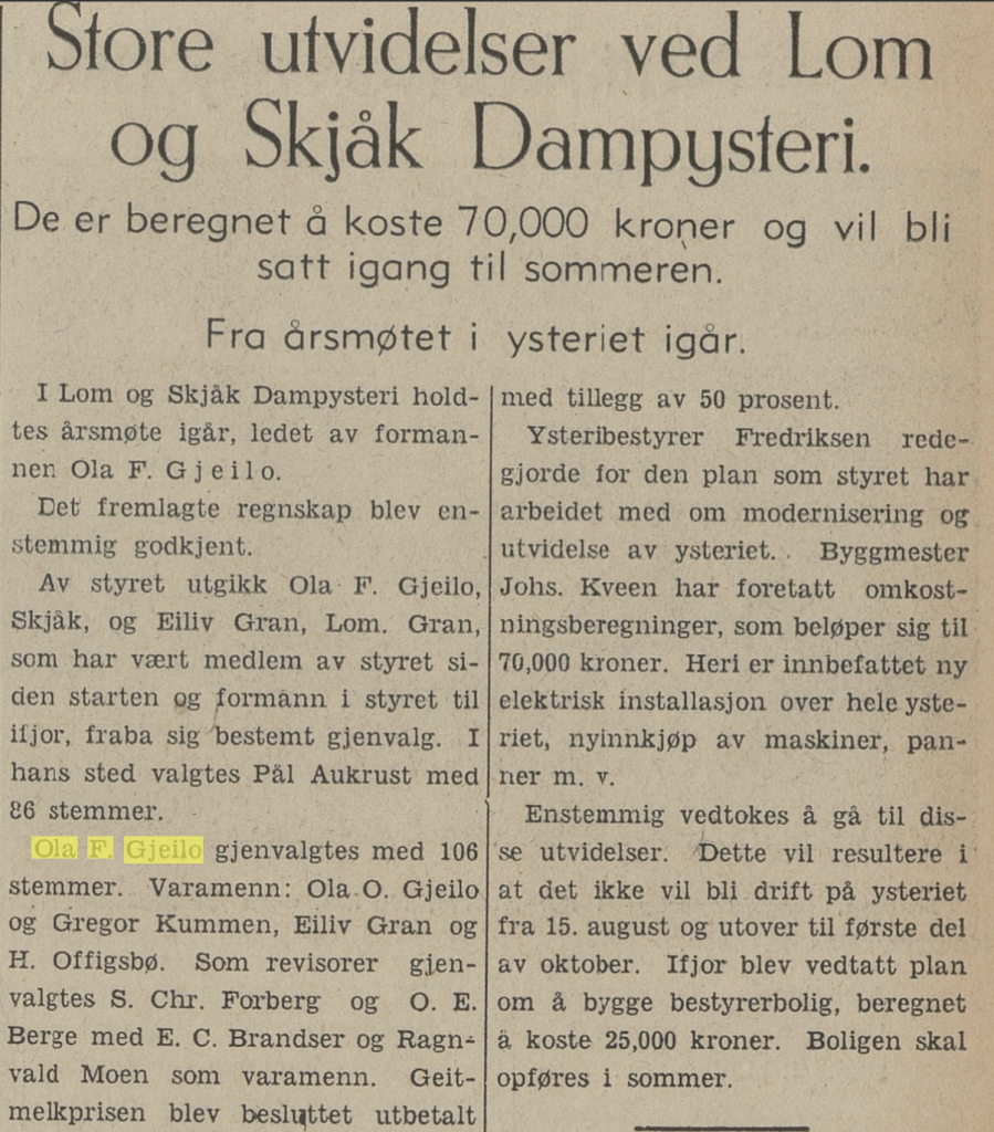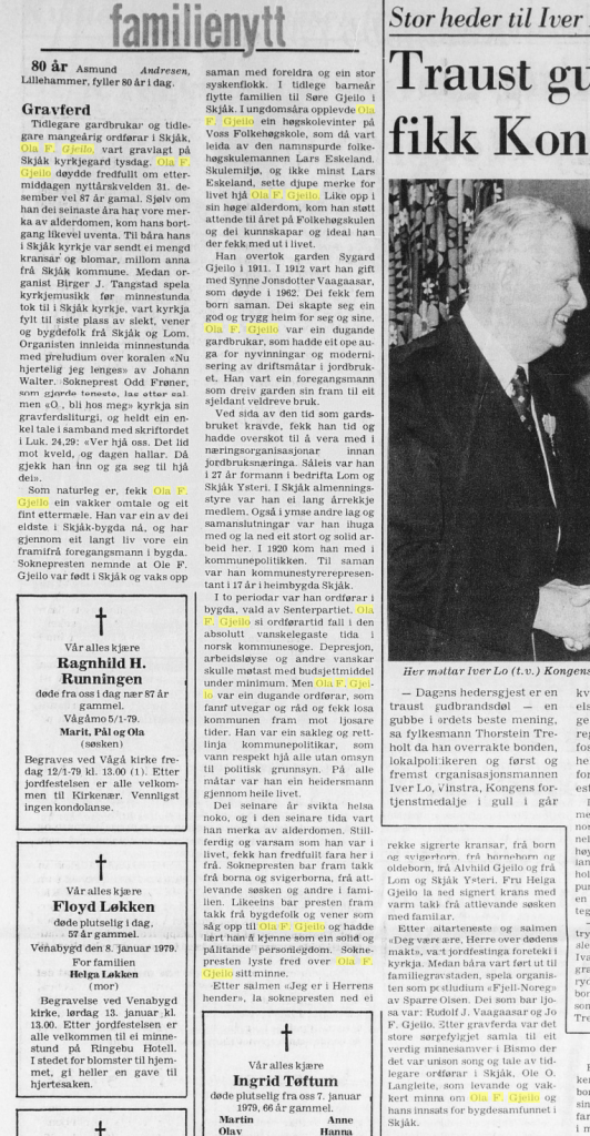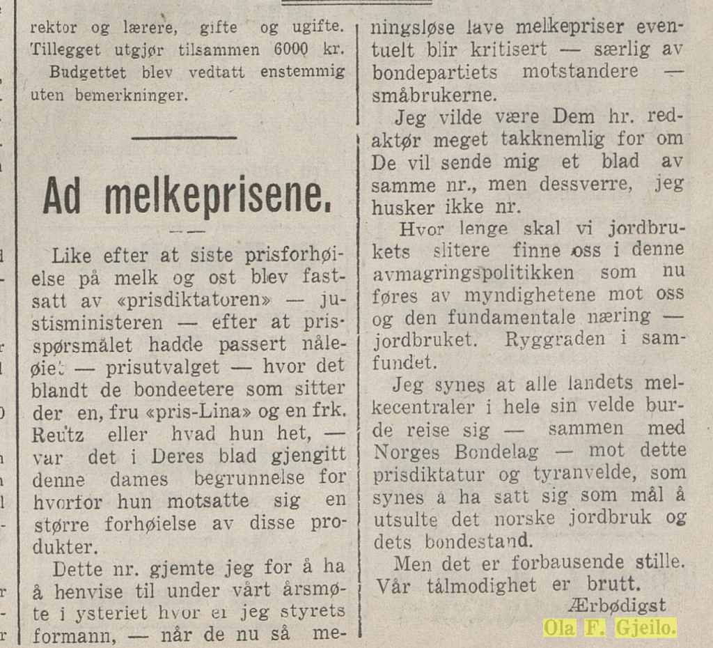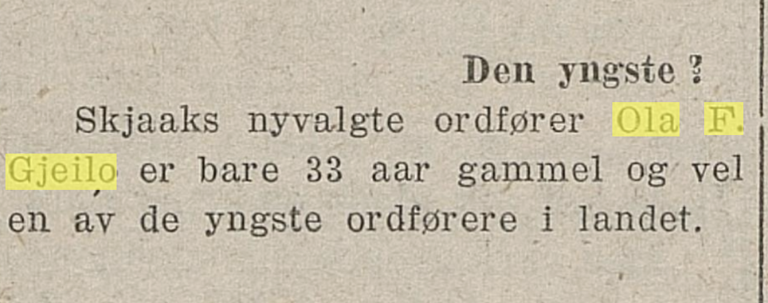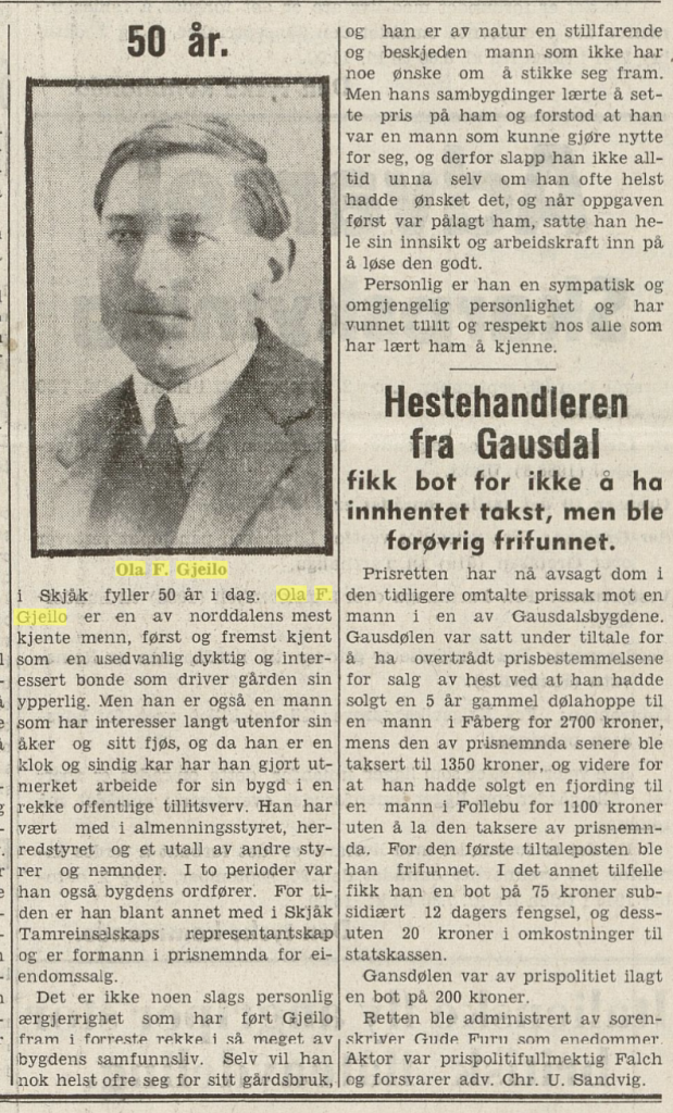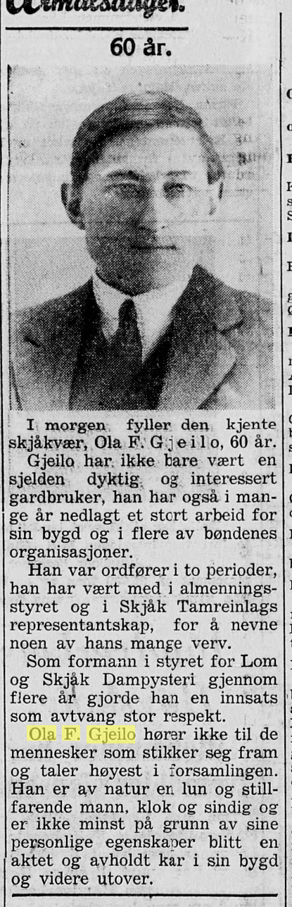 Da Ola F. Gjeilo fylte 80 år var denne artikkelen innteken i avisa. Det går ikkje fram av utklyppet kven som har skrive innlegget.