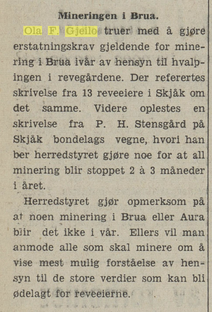 Under ei samtale med Ola F. Gjeilo for ei tid sidan kom han inn på og fortalde frå ordførartida si og særleg da um korleis økonomien i kommune stadig kravde hugsott og omtanek. Kommunekassa var jamnan på det næraste tom, og å få låne pengar for kommuna den gongen var så å segja uråd. sjølv til det mest naudsynlege og um ein fekk lånt, så var rentene høge og vilkåra utormåte harde. For ein del år attende gav Gjeilo ut eit hefte med erindringar frå si ordførartid, der han også skildrar kor vanskeleg økonomien var for kommunane i dei trongaste millomkrigsåra.