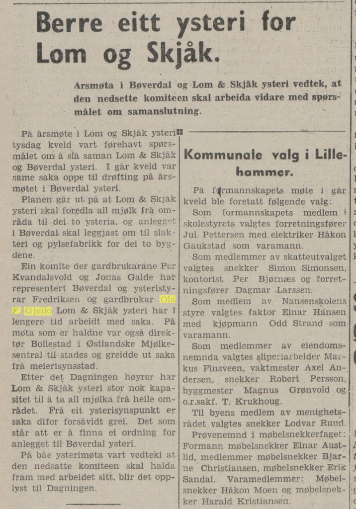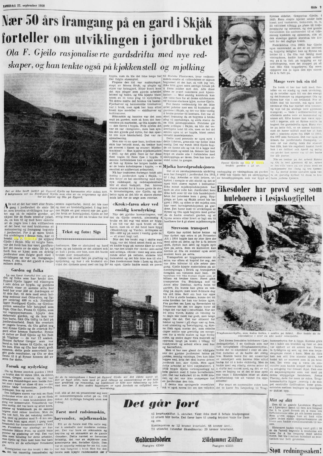 Sjå avisoppslag i GD 1958 om gardsdrifta på Sygard.